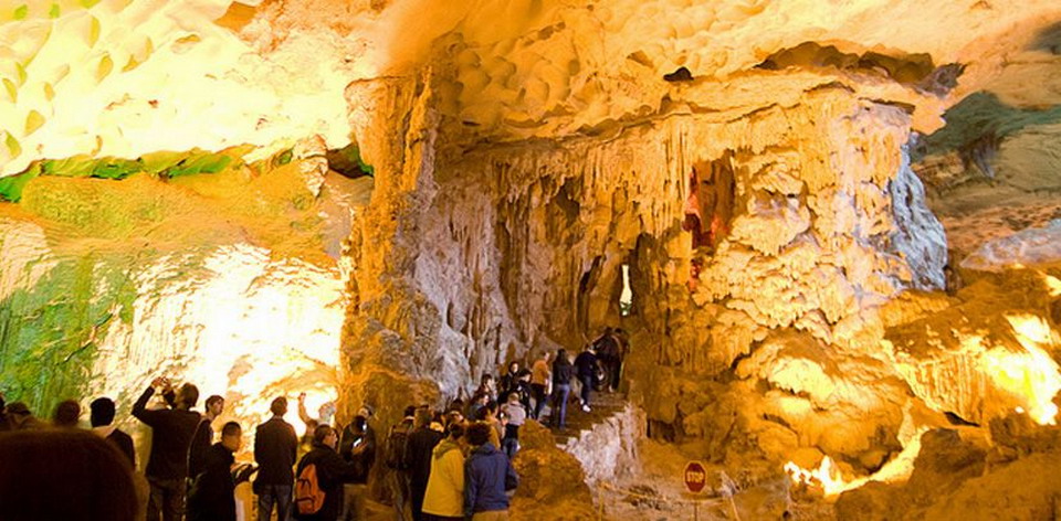 Hang Dau Go is one of Vietnam’s most beautiful cave, to be located on Dau Go Island in Halong Bay, It is 6km far away from Bai Chay tourist port. Dau Go cave is large at 5,000 m2, the entrance to go inside the cave with 17 m of width 12 m heights. Dau Go cave situated at an altitude of 27 meters over sea level, the Dau Go Cavesame age with Thien Cung grottoes’ formation – It was formed in the late period of Pleixtocen about 2 million years to today. Dau Go cave concentrates a lot of stalagmites and stalactites, these are looking like as a complex of ancient architecture. Dau Go Cave displays the ancient beauty, the peace and neglecting, traveler will see the big stone columns, stone pillars, stalagmites, stalactites so that Dau Go Cave looks like as a HEAVEN. The cave divided into three chambers. The first compartment with stalactites system that has many familiar images to life: lions, pythons, turtles, and even a pair of fighting cock’s image… The second chamber, starting with a monumental painting picture, it is an images of the rocks with the waves in the middle of ocean. The 3rd compartment, it is the image of huge stone pillars. This cave is one of highlights for Halong tours & Halong bay Cruises