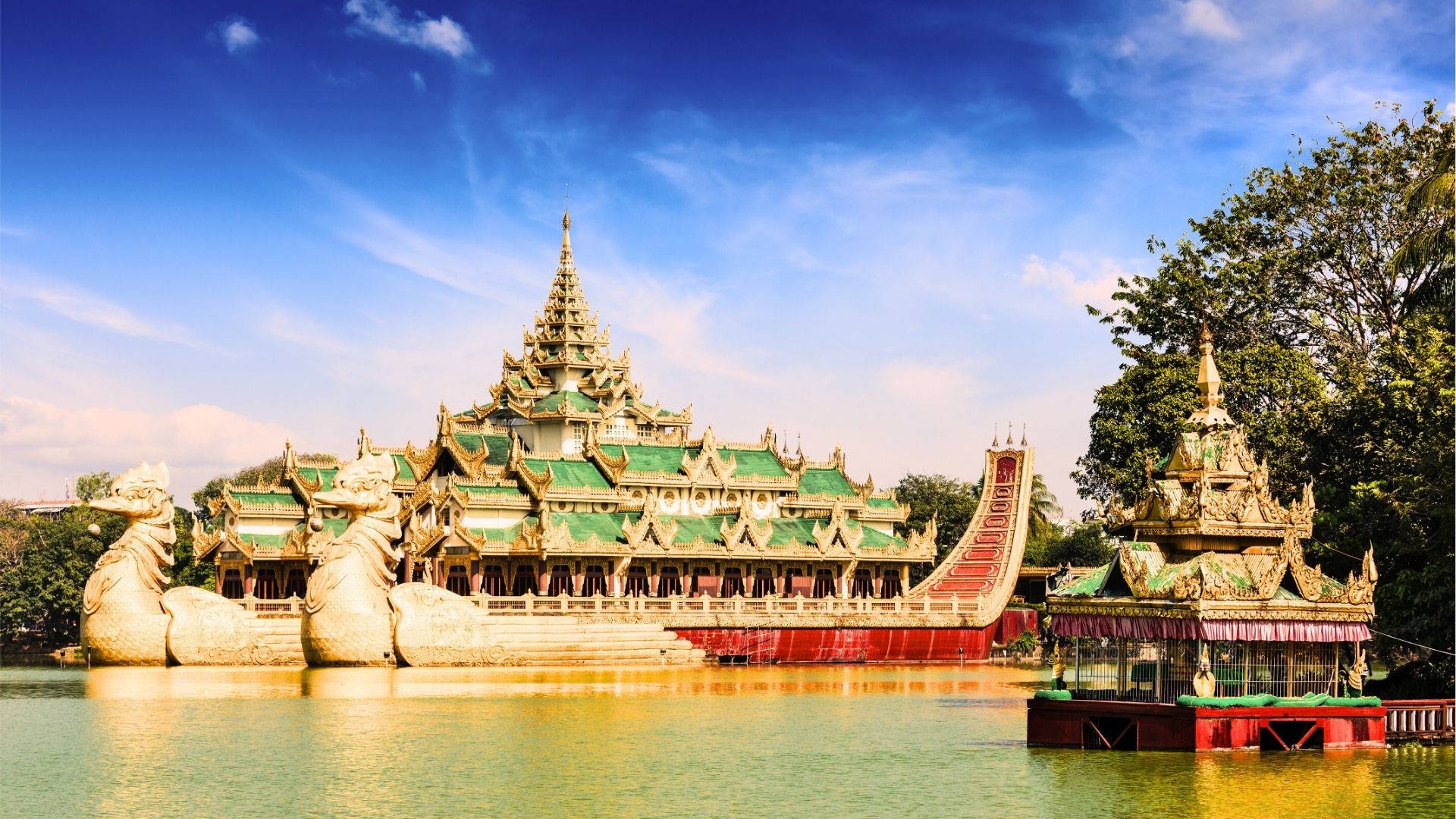 • A última hora de la tarde, haga una parada fotográfica en el icónico Karaweik Hall, una majestuosa barcaza real flotante situada en el lago Kandawgyi. Continúe hacia la legendaria Pagoda Shwedagon, el sitio religioso más importante y venerado de Myanmar. Admire su brillante estupa dorada mientras observa a peregrinos y monjes ofreciendo sus oraciones. El día concluye con una inolvidable vista del atardecer sobre la pagoda, creando una primera impresión espiritual y memorable de Yangón.